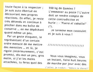 Parfois avec un phrasé direct, toujours teinté d’humour, nous voyageons avec Gamino, son compagnon à crinière, et cheminons de jours en jours, de rencontres en découvertes, de doute en émerveillement, dans une ambiance poétique…